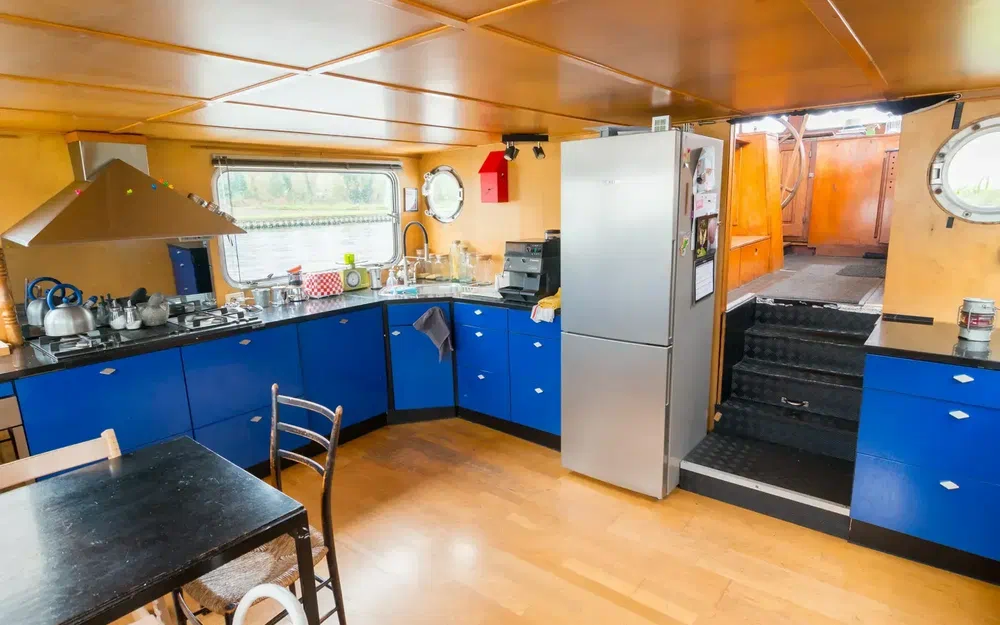 vers la cuisine de 15m2 équipée, frigo congel, gazinière, four à gaz, et nombreux rangements