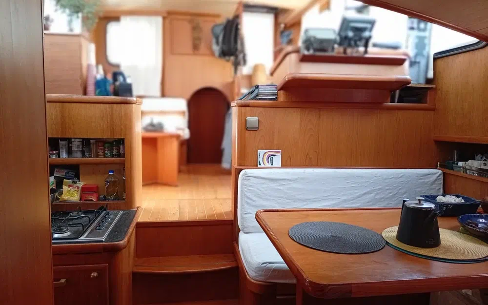 Cuisine toute équipée avec plaque cuisson gaz quatre foyers, four électrique et réfrigérateur 100L 12V/220V et gaz R600 65 gr encastrés dans coffres bois teck, congélateur séparé 36L 12V sous banquette repas. Nombreux rangements bois intégrés.