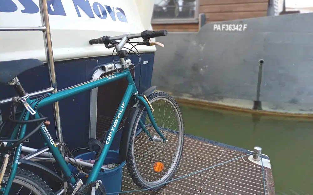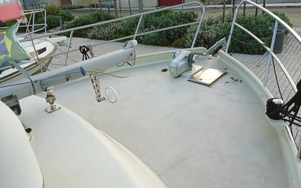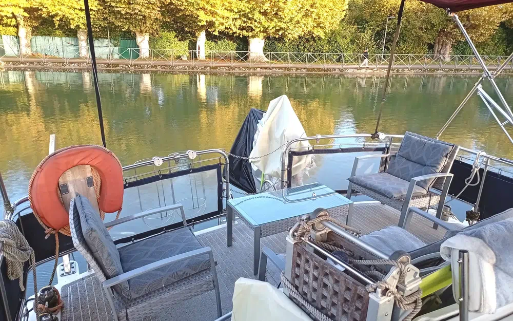 Plateforme arrière, au niveau de l’eau, coulée dans la coque métal du bateau, en inox sur l’épaisseur et recouverte de liège, avec échelle structure inox repliable. Profondeur confortable de 1,25m pour 2 transats, accessible par échelle inox depuis le pont arrière.