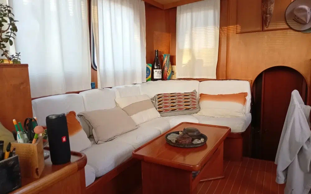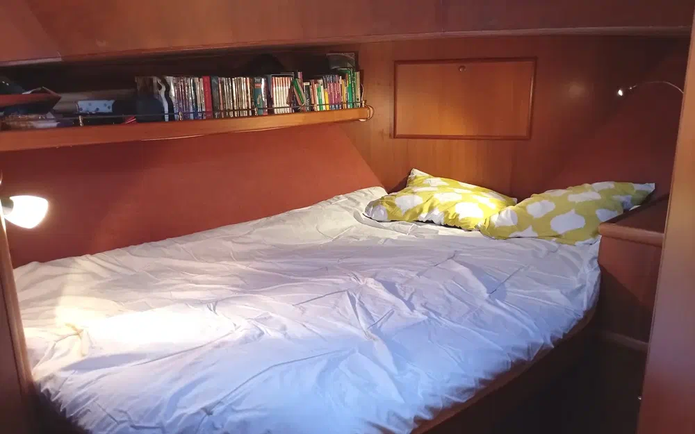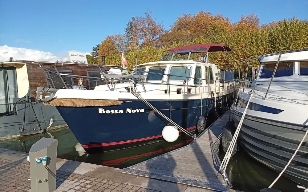 Vedette yacht hollandaise sortie du chantier de renom AQUANAUT à Sneek aux Pays-Bas en 2006, avec un moteur puissant pour la navigation fluviale et maritime. Judicieusement aménagée, avec une largeur confortable de plus de 4m permettant 6 vrais couchages (3 doubles, dont un avec repli astucieux de la table repas), sa salle d'eau arrière est d’un confort spatial exceptionnel, et donnant par une porte sas vitrée sur la plateforme arrière rallongée. Les équipements et composants de qualité, l’isolation thermique et phonique avec double vitrage, les belles finitions et détails de menuiserie – lambris en plafond en bois clair usiné, panneaux de placage teck en cloisons, arrondis plaqués en angle, poignées en cuivre - viennent compléter cette vedette, très agréable à vivre, occasionnellement ou à l’année, et à naviguer.