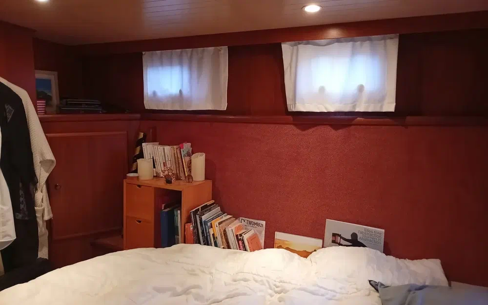 2 hublots latéraux ouvrants et 1 hublot central ouvrant 50x50cm sur la paroi arrière, une penderie en angle et une petite penderie/meuble étagères sur le côté du lit.