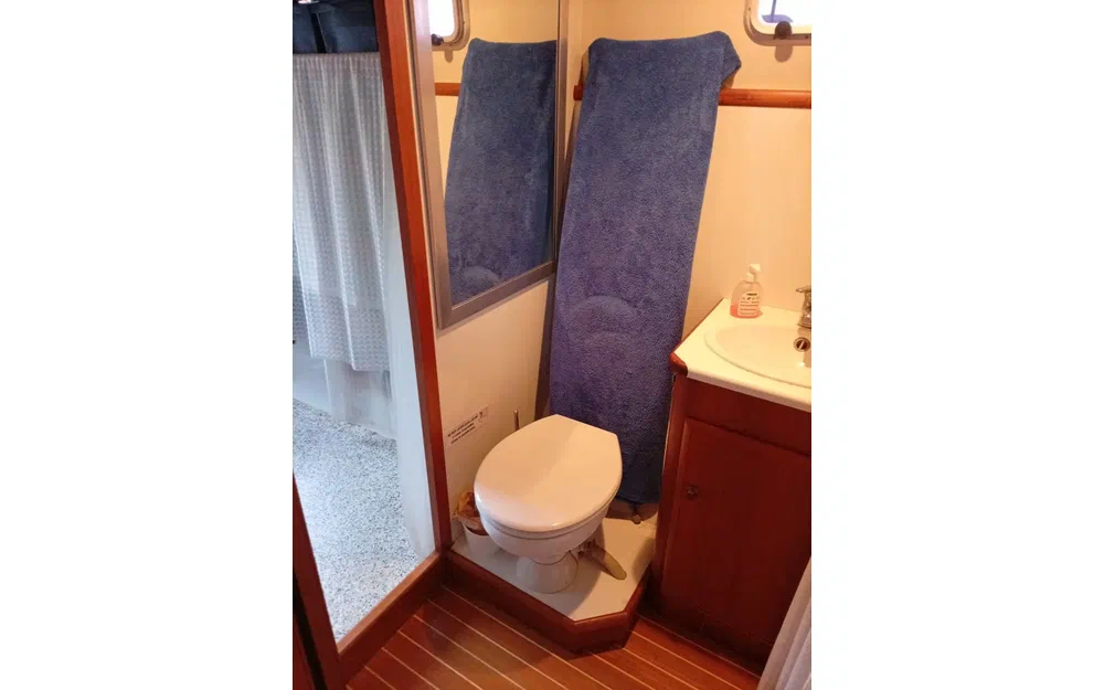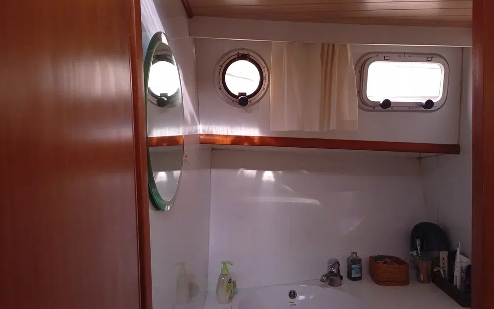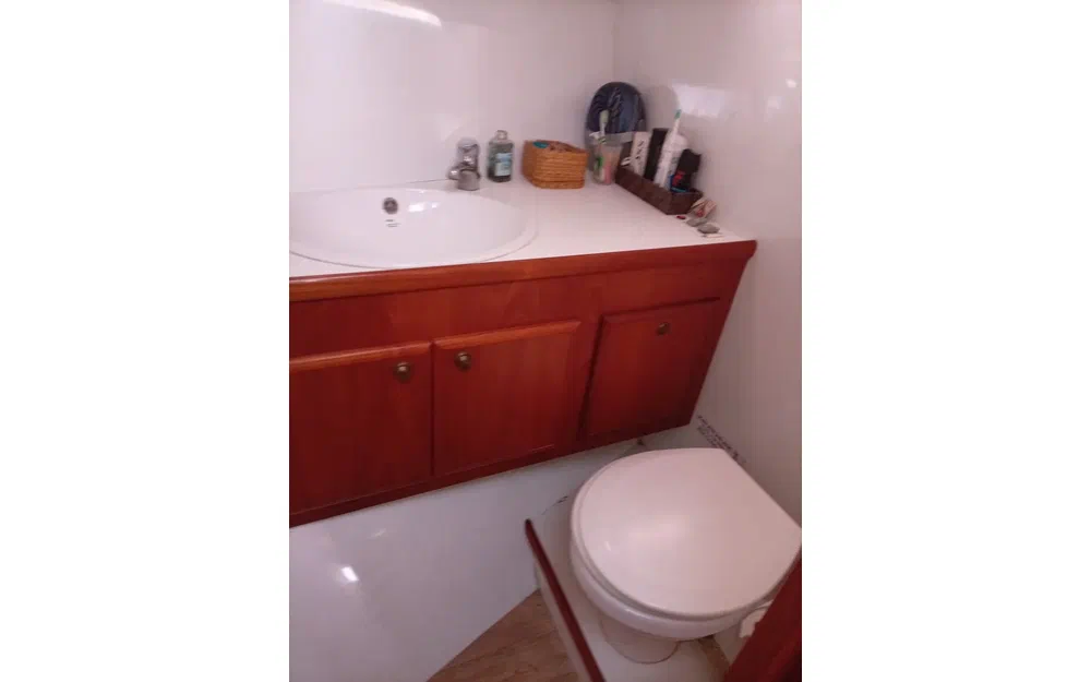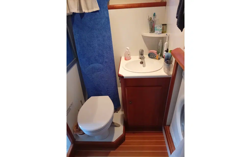 - 1 salle d’eau avant liée à la cabine avant, avec WC semi-broyeur commande électrique 2 positions, meuble vasque, et hublot.